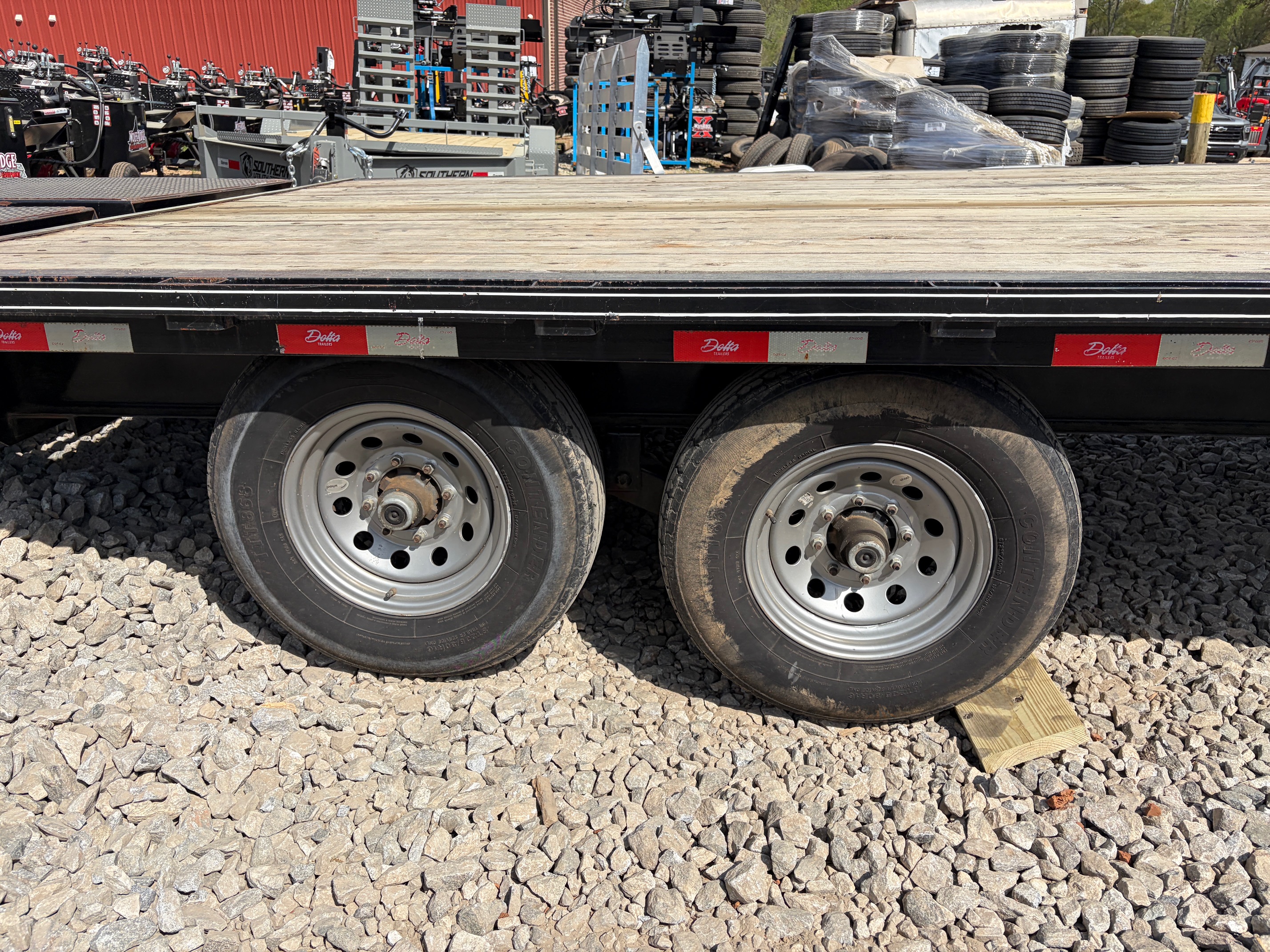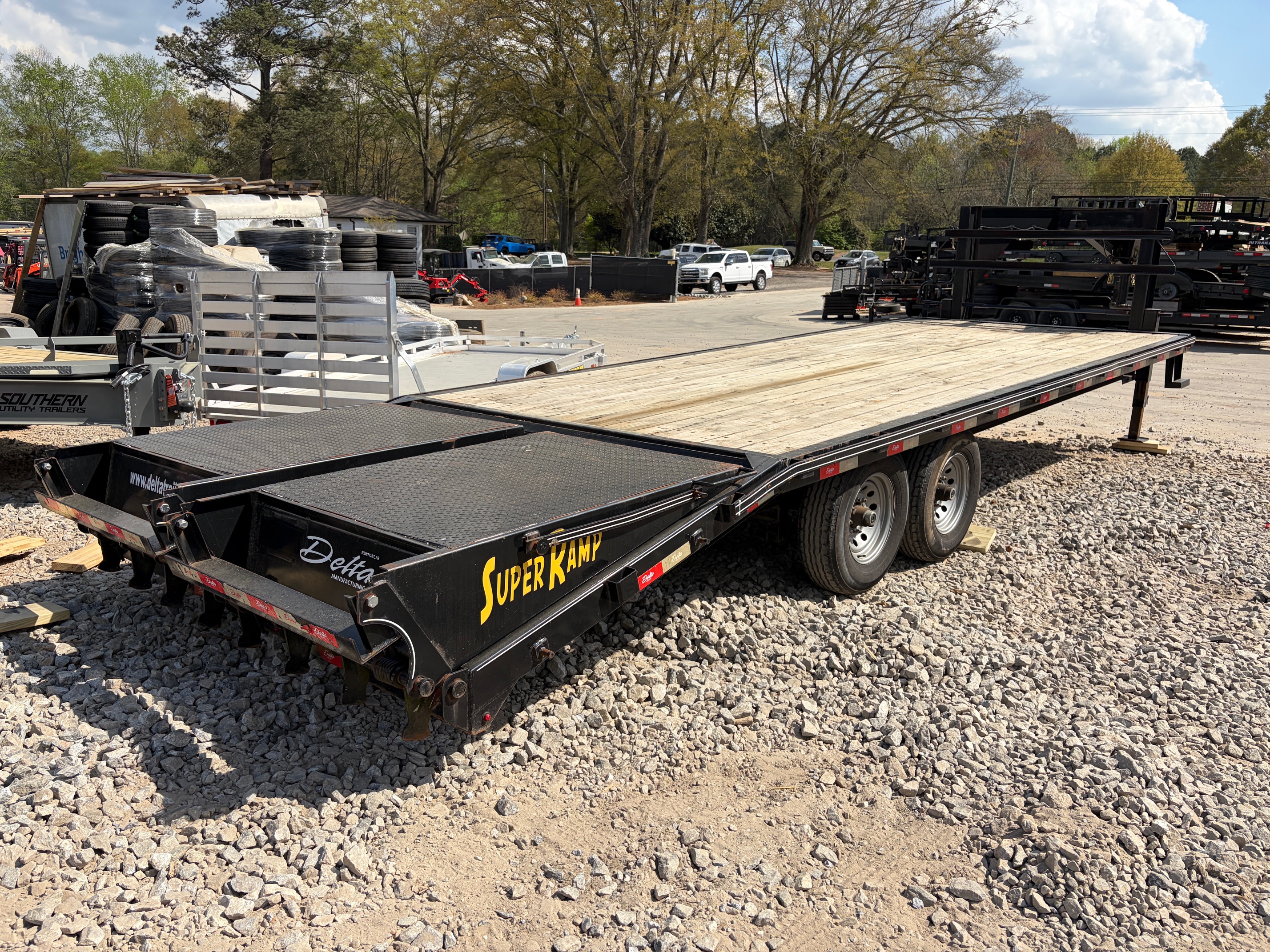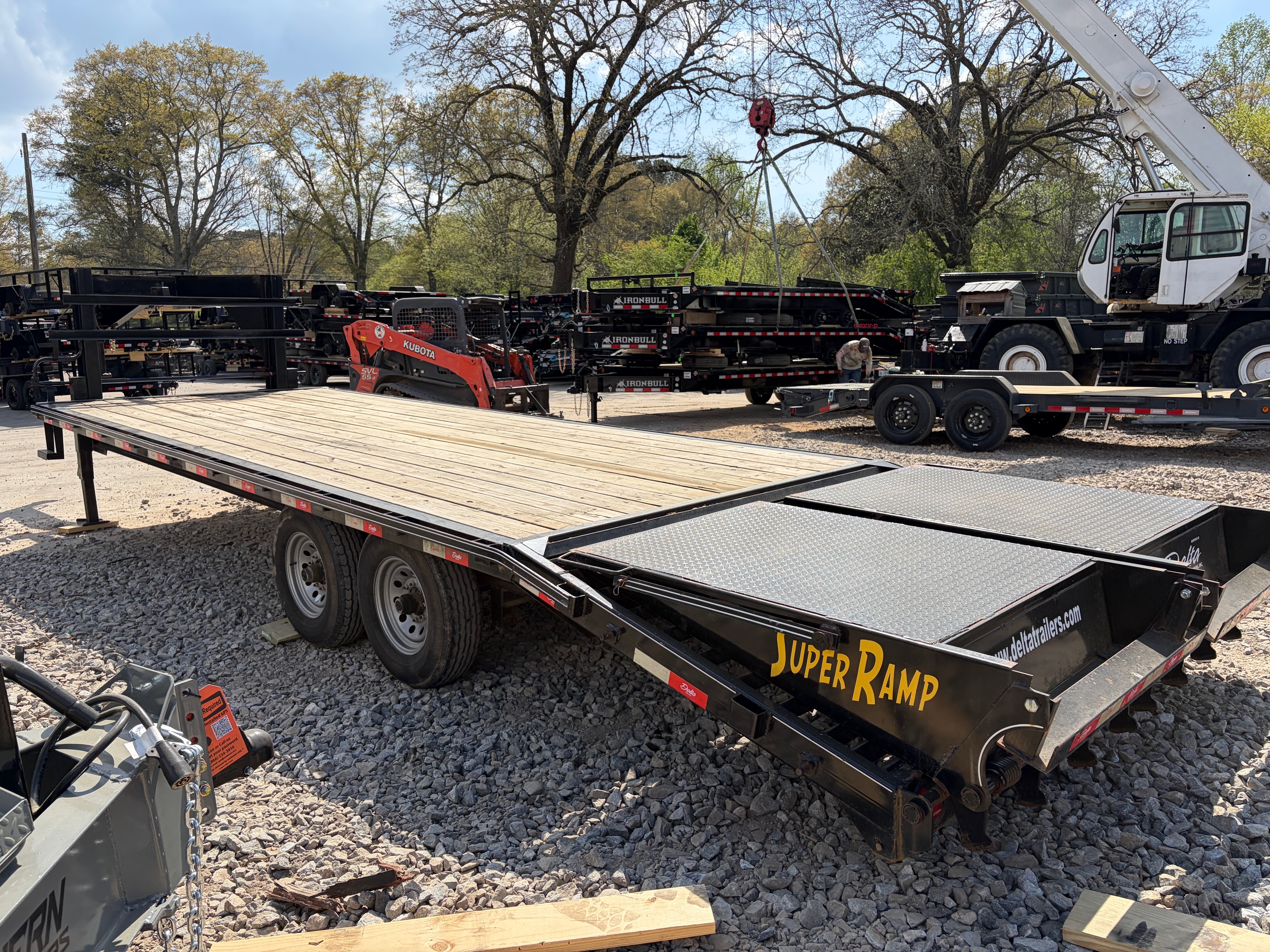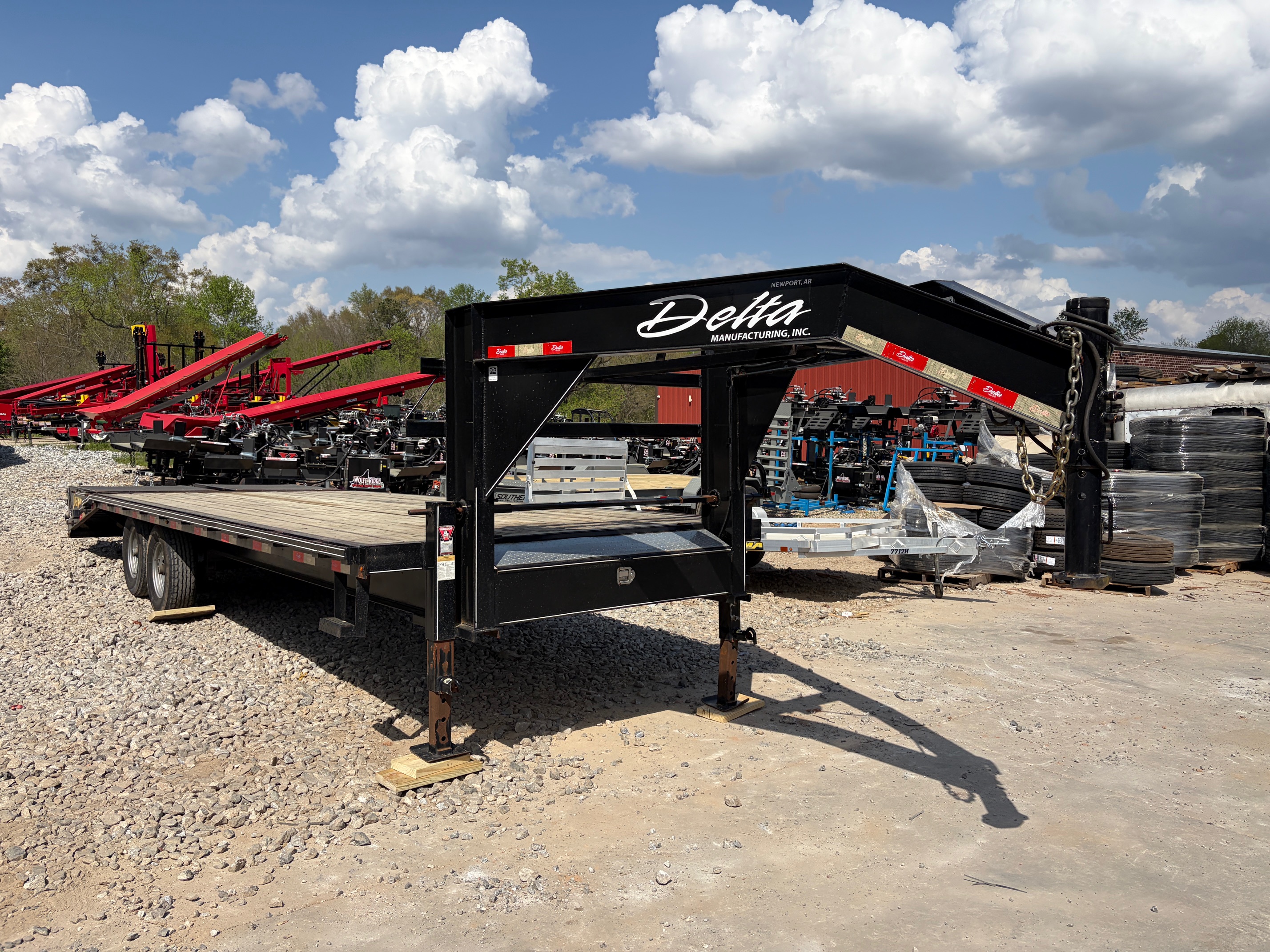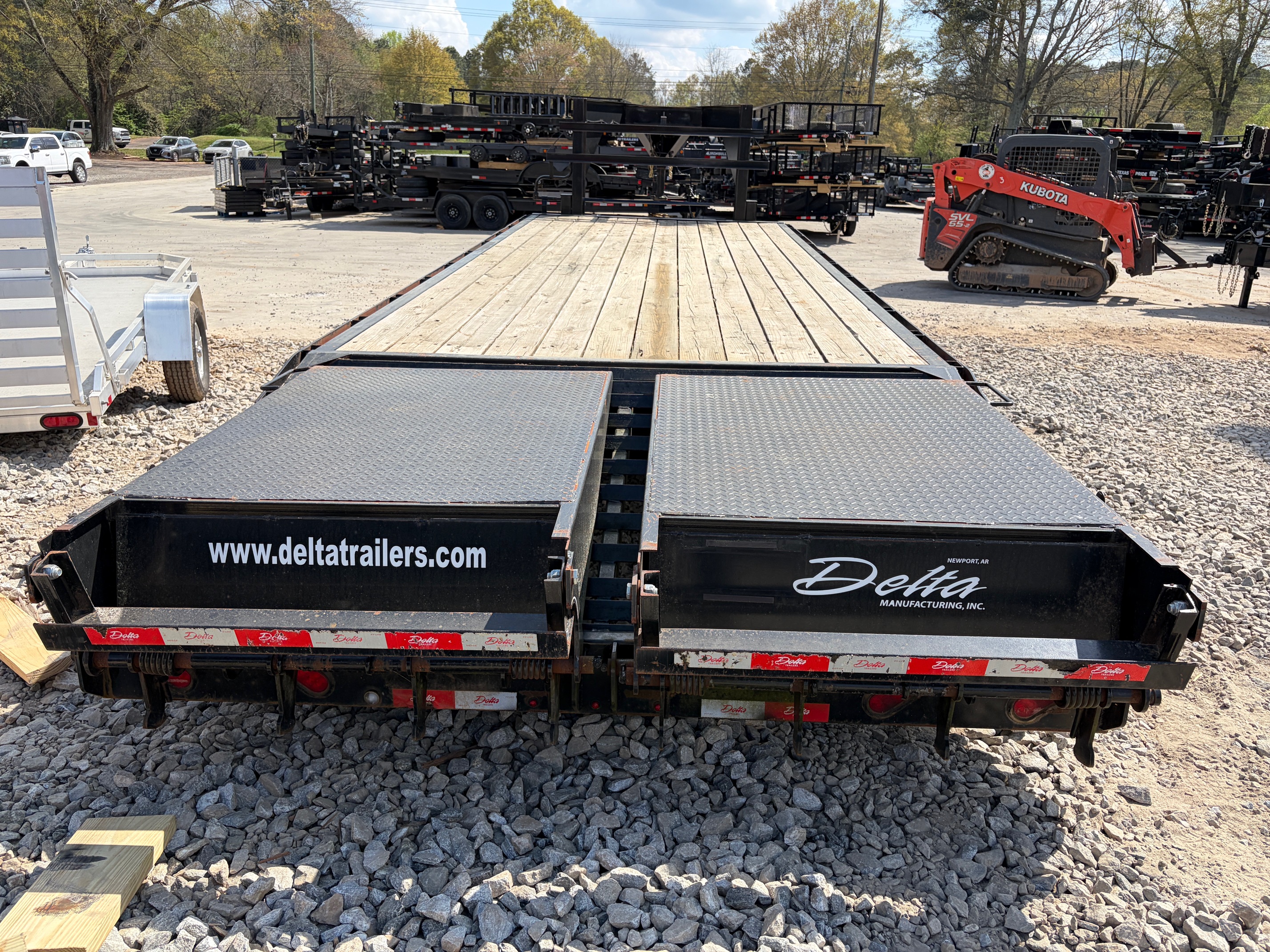 USED as is 8.5x25 Delta gooseneck deckover built for hauling heavier equipment with stability and strength. Equipped with dual 10k axles, dual jacks, and a 5’ dovetail with mega ramps, this trailer is ready for skid steers, tractors, and larger loads.