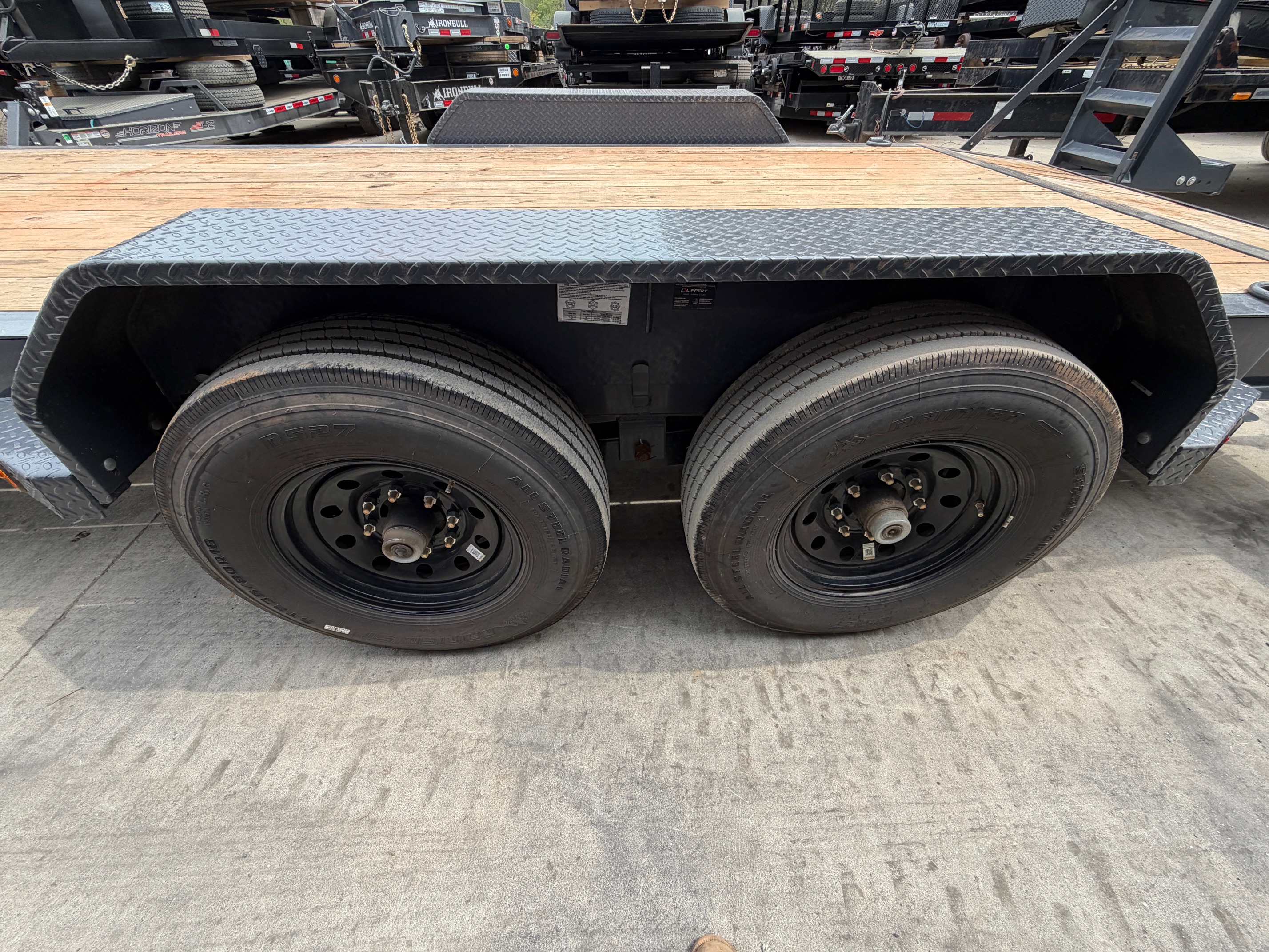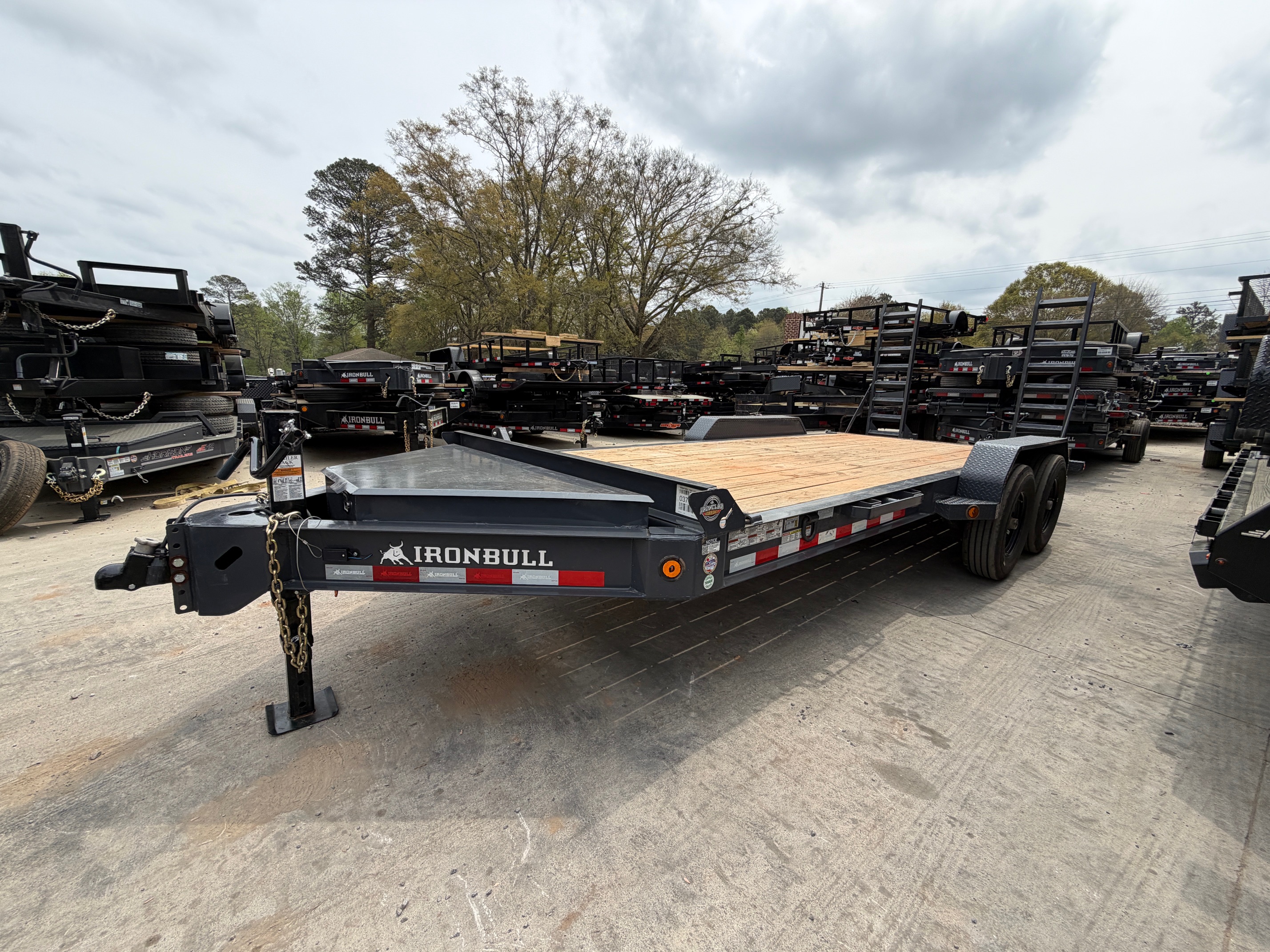 Solid 7x18 Ironbull equipment trailer built for dependable hauling. This unit features a heavy-duty 8" I-beam frame and upgraded 14-ply tires for added durability and load support. Equipped with a 10k jack, front toolbox, and stand-up ramps for easy loading and convenience on the job.