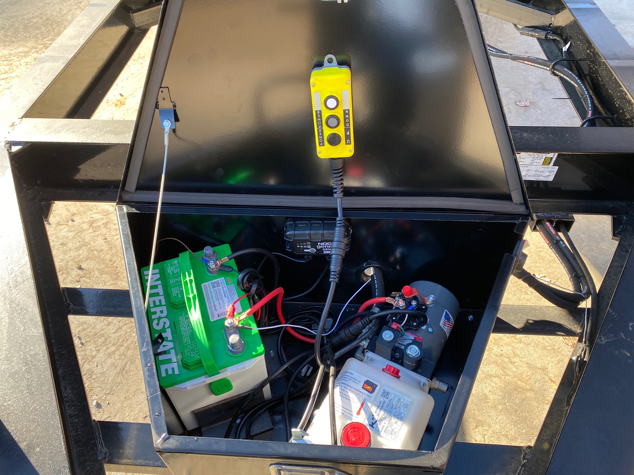 Full power hydraulic tilt with battery and pump, entire 22 foot deck tilts
