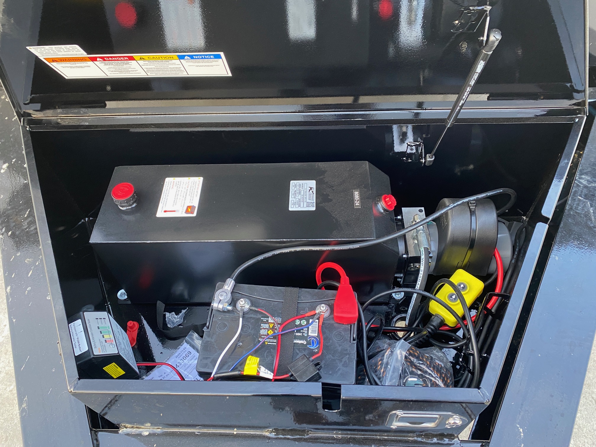 1/8 Treadplate Steel Fenders, Lockable Toolbox (Houses Battery and Pump), 2 - Way Gate (Barn Doors & Spread Gate), 6' 6 Slide In Channel Ramps, 4 - D-Rings (Welded inside the Box), steep 40 degree dump angle, 12VDC Hydraulic Pump , 8 x 10 lb. I-Beam Frame & Tongue, 3 Channel Crossmembers 16 inch on center, 10-ga. Sides and Floor, 83 inch wide bed, 24 inch High Sides, Ultra Low 24- 28 Deck Height, 110V Integrated Trickle Charger
